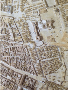 Detalle. León Gil de Palacio. En el Atlas Histórico de la Ciudad de Madrid, 1850-1939. Maqueta de la Ciudad,1830.Sin embargo se aprecia un cambio significativo que condicionará las actuaciones posteriores, la introducción de vegetación a lo largo del paseo. Son de especial interés las actuaciones que se realizaron a finales del siglo XIX en relación con el Paseo del Prado y Paseo de Recoletos. Se diferencian dos tipos de intervenciones: