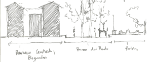 El eje Prado-Recoletos es un eje muy importante en Madrid. Desde el Norte es la puerta de acceso desde el Madrid contemporáneo, y por el sur, desde el Madrid clásico.Se trata de un espacio singular, deteriorado por el paso del tiempo, los efectos del intenso tráfico y las sucesivas intervenciones sin criterios homogéneos. Las relaciones con el barrio adyacente, El Barrio de las Letras, vienen delimitadas por la longitud de las manzanas, por las vías de conexión así como por las actuaciones para mejorar el flujo del tráfico rodado en esta parte de la ciudad. Existen muy pocos casos en los que el barrio y el eje se interrelacionen a través de espacios a escala del peatón, espacios amplios que funcionen como filtro entre la trama urbana y el gran paseo. Serían una excepción: la plaza de la Platería de Martínez, que no llega a funcionar del todo como un espacio amable para el peatón por la incidencia de los 4 carriles de tráfico que la limitan en su encuentro con el paseo; y la plaza del Caixa Fórum, a la que le ocurre lo mismo que a la anterior pero incorpora nuevos elementos de interrelación que le otorgan un carácter diferenciado y positivo: el marco y la penumbra. Por todo ello se deben clasificar las interrelaciones en dos tipos muy diferentes: – Conexiones visuales – Conexiones reales