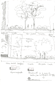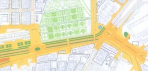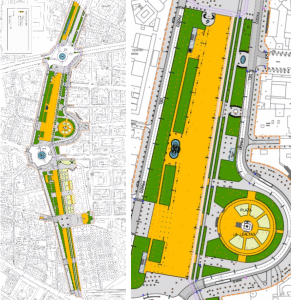 Por otro lado, en la otra propuesta presentada, cuya información se ha podido obtener a través del apartado de publicaciones de la web del “Club de debates urbanos”, sí que se presenta una solución para esta no-relación. Se propone un claro ensanchamiento de las aceras y, por tanto, mejora del área peatonal, pero además se reduce el número de carriles de tráfico rodado de 4 a 3+1 auxiliar desvinculado de los otros tres a través de vegetación, cuando la sección lo permite.