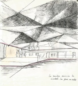 Desde este punto el propio edificio está realzando su espacio inferior, invitando al espectador a aproximarse para saber qué ocurre dentro; por tanto, aquella persona que tenía un objetivo claro (y lineal) y se encuentra por primera vez con este espacio, como mínimo se detendrá a realizar una foto, y probablemente a aproximarse a apreciar lo enmarcado y saber si podría formar parte de ello.