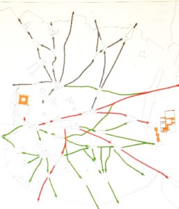 Por el contrario, encontramos una estructura repleta de sendas sin continuidad transversal en contraposición sendas que atraviesan el barrio longitudinalmente, algunas de ellas articuladas a través de nodos históricos y contemporáneos. La concentración de un uso o una actividad especial en una calle, puede darle a ésta prominencia en las mentes de los observadores. Las personas parecen ser sensibles a las variaciones en la cantidad de actividad que encuentran y a veces se orientan en buena medida siguiendo la principal corriente de tráfico, actitud errónea en este caso, como se verá posteriormente.