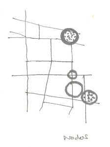 En este caso, al estar analizando una escala de barrio, los nodos son aquellos ensanchamientos de las sendas, espacios abiertos que articulan los edificios en relación dichas sendas o la confluencia de varias sendas en un mismo punto, generando un espacio abierto amplio. Se podría hablar de nodos en la Plaza de la Patería Martínez y el espacio urbano asociado al centro cultural Caixa Fórum.